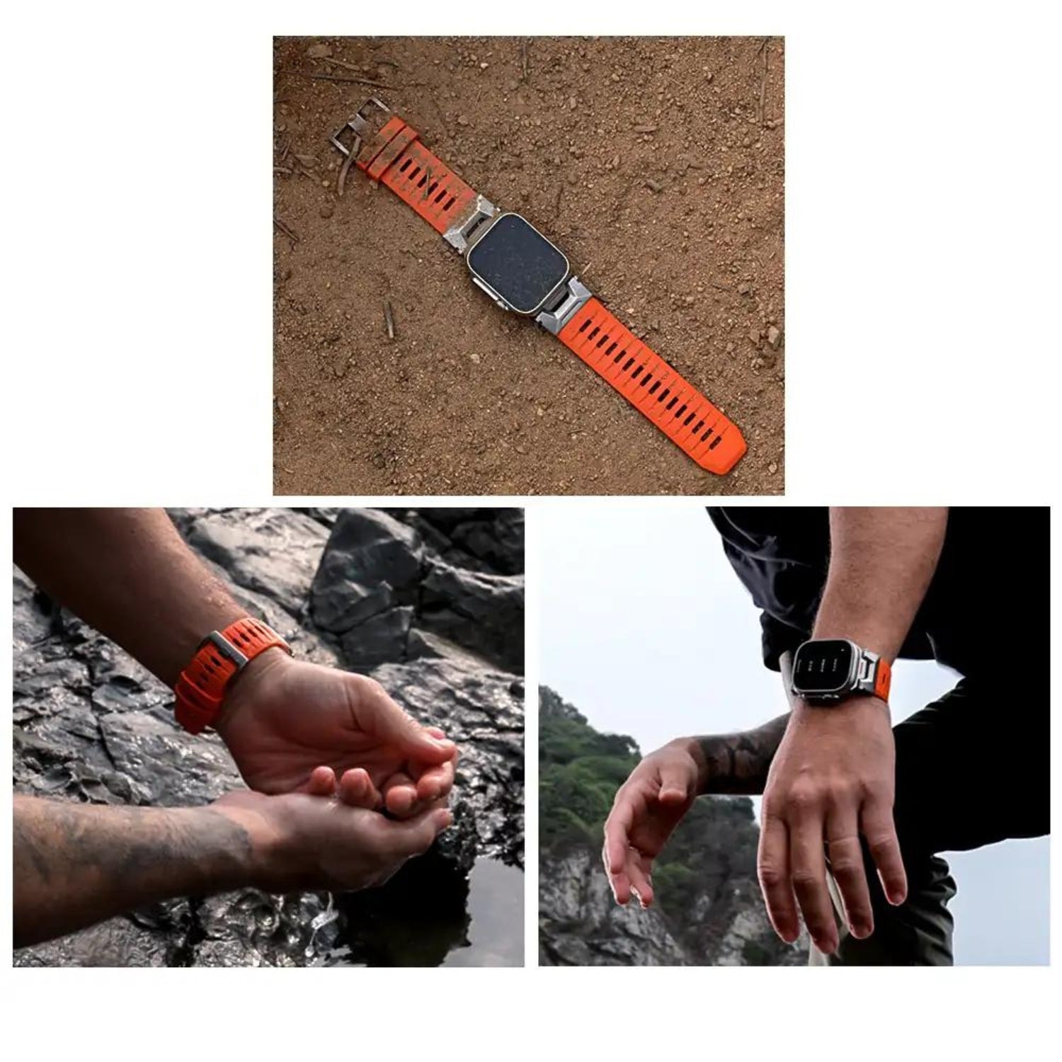 The custom-designed injection-molded stainless steel metal connector provided a firm fit and a unique style. Matte-finished connector with orange accents coordinate visually with the color of the Apple Watch Ultra movement knob, adding a touch of sophistication to the sturdy exterior.