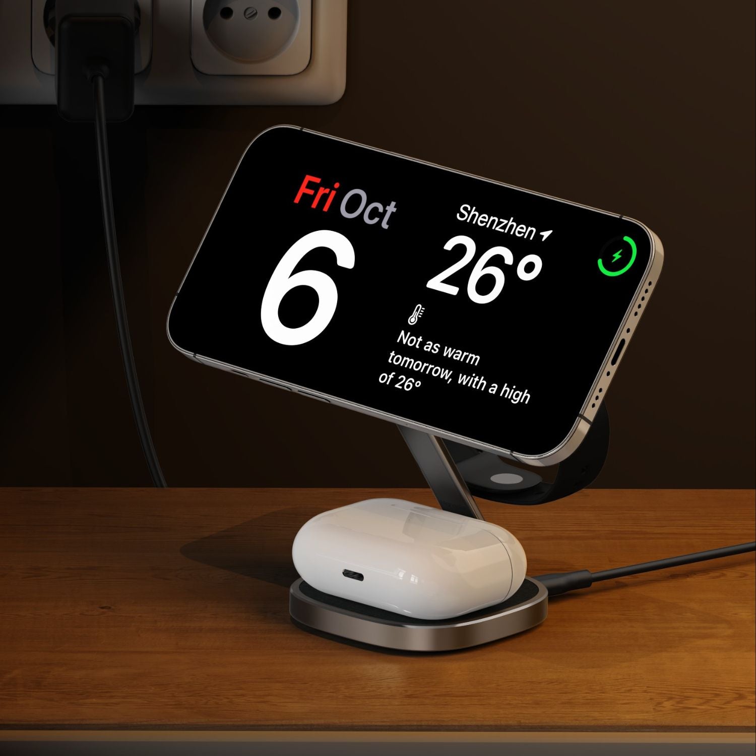 Charge your Apple devices conveniently and wirelessly in one place. The new 3-in-1 NanoMag Trio Wireless Charger from Lavish Concept simultaneously charges MagSafe-compatible iPhone models, Apple Watches, and AirPods. The user-friendly stand holds your iPhone in either portrait or landscape orientation.